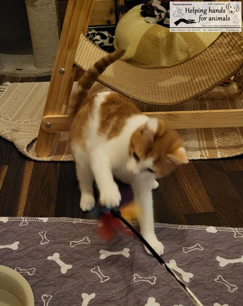 Auf der Pflegestelle lernt Polly durch ihre Pflegemamis, dass es auch gute Menschen gibt, die ihr Leckerchen bringen und sich um sie kümmern und mit welchen man auch Spaß mit Spielen haben kann.  Das junge Mädchen lässt sich mittlerweile streicheln und kraulen. Sie hat gute Ideen und eine lustige Art das Pflegezimmer auf den Kopf zu stellen.