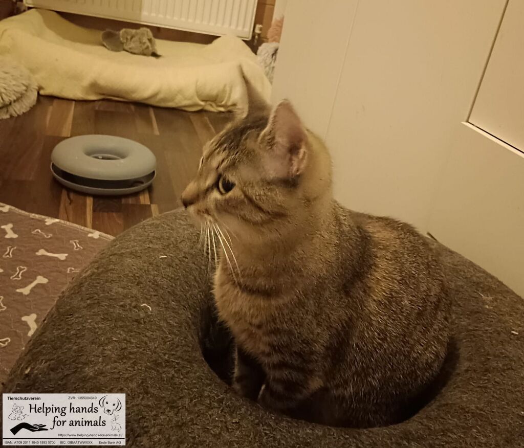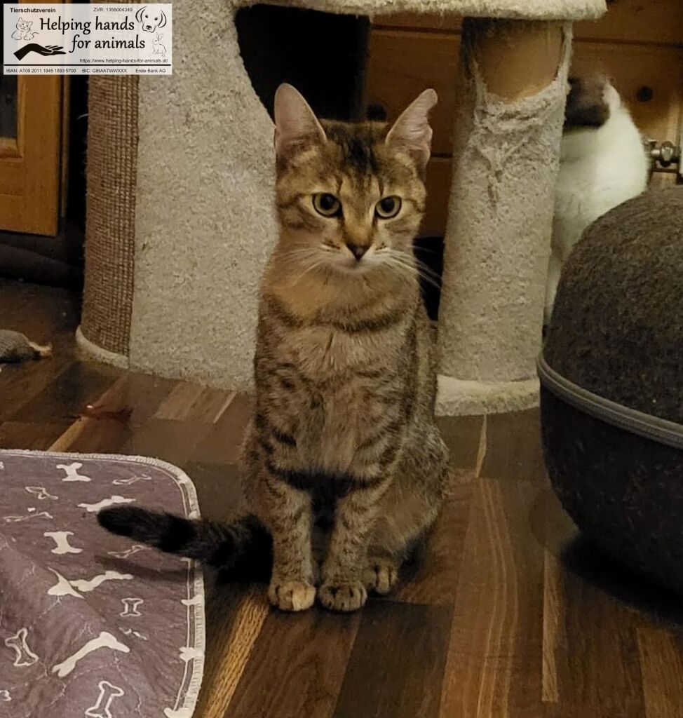 ISIS kam im Juli 2025 auf unsere Pflegestelle. Die junge Dame war damals Mutter von 3 hübschen Kitten die gemeinsam mit ihr ein Zimmer bei uns beziehen durften. Sie hatte große Angst vor Menschen, weil sie bei einem alkoholkranken Menschen lebte, der keine Tiere halten durfte und sich um die kleine Familie auch nicht kümmerte.
