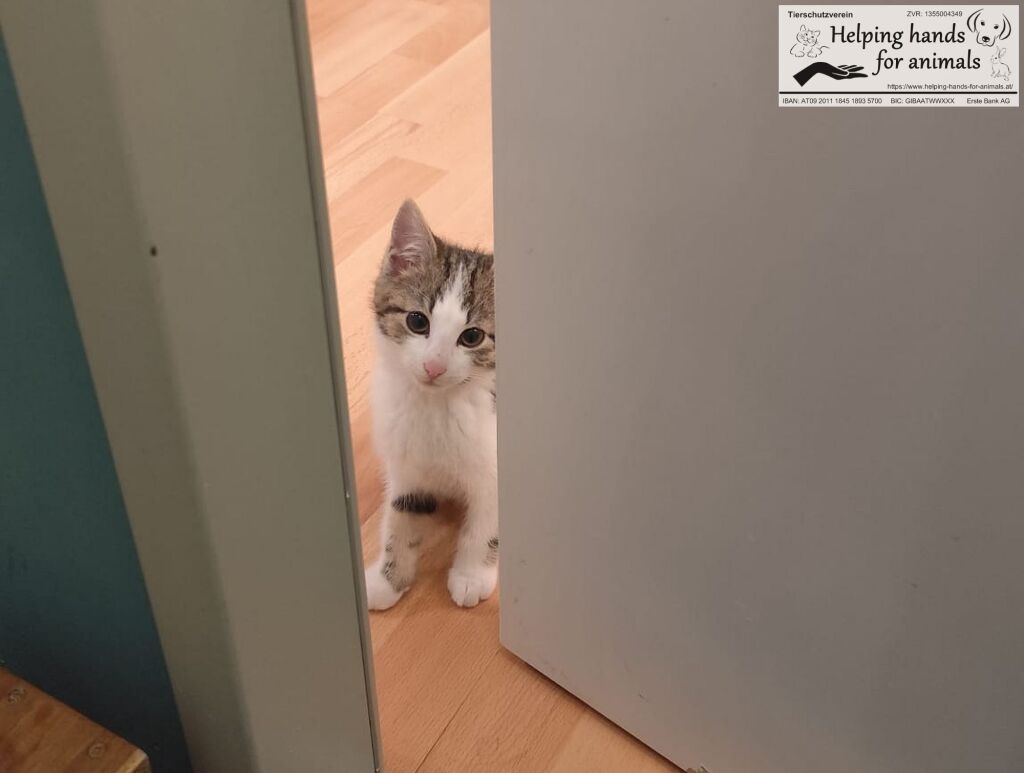 JOEY, CORY und GUCKI kamen Anfang Dezember zu uns auf Pflege. Anfangs waren sie alle scheu und fanden Menschen eher beängstigend. Inzwischen aber sind sie aber schon auf einem sehr guten Weg und lassen sich alle drei von uns streicheln und schnurren auch. CORY, der grau-weiße ist der vorsichtigste der Bande und ist vor allem anfangs noch sehr zurückhaltend.