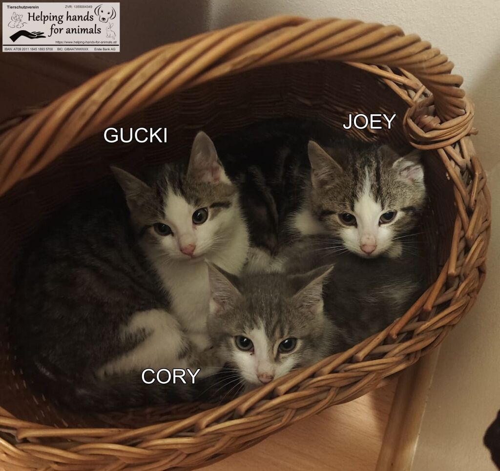 Wenn er aber entspannt in seinem Körbchen liegt, können wir ihn gut streicheln und er genießt es sehr. JOEY, der kleine Flauschige ist ein richtiger Draufgänger und hat im Umgang mit uns gar keine Angst mehr. Er sucht aktiv Kontakt und ist ein richtiger Kuschler. GUCKI, der Größte der Bande hat auch kaum mehr Angst und genießt seine Streicheleinheiten und sucht bewusst unsere Nähe.