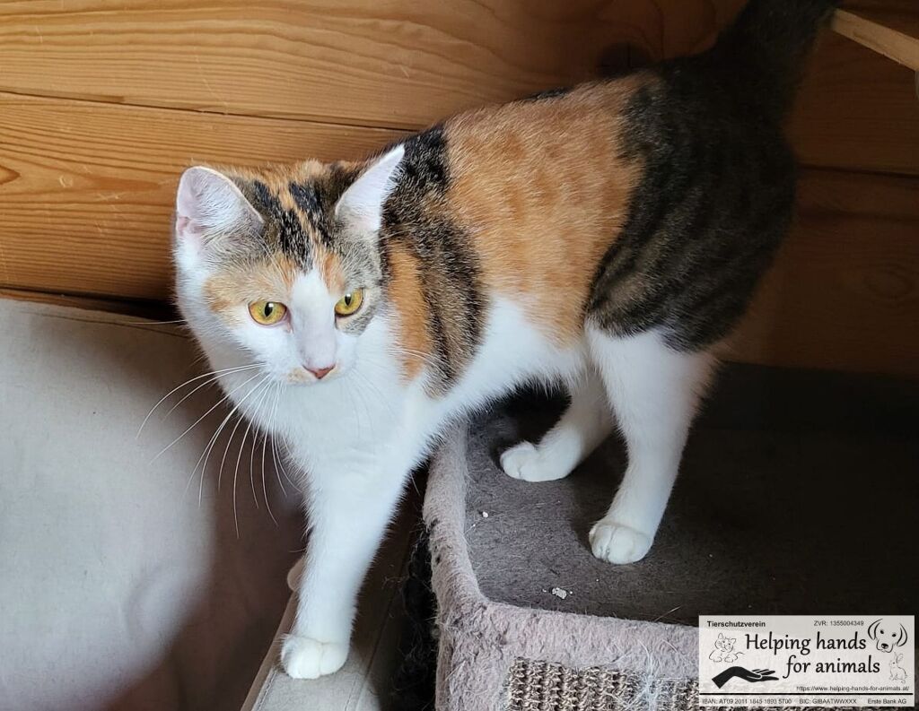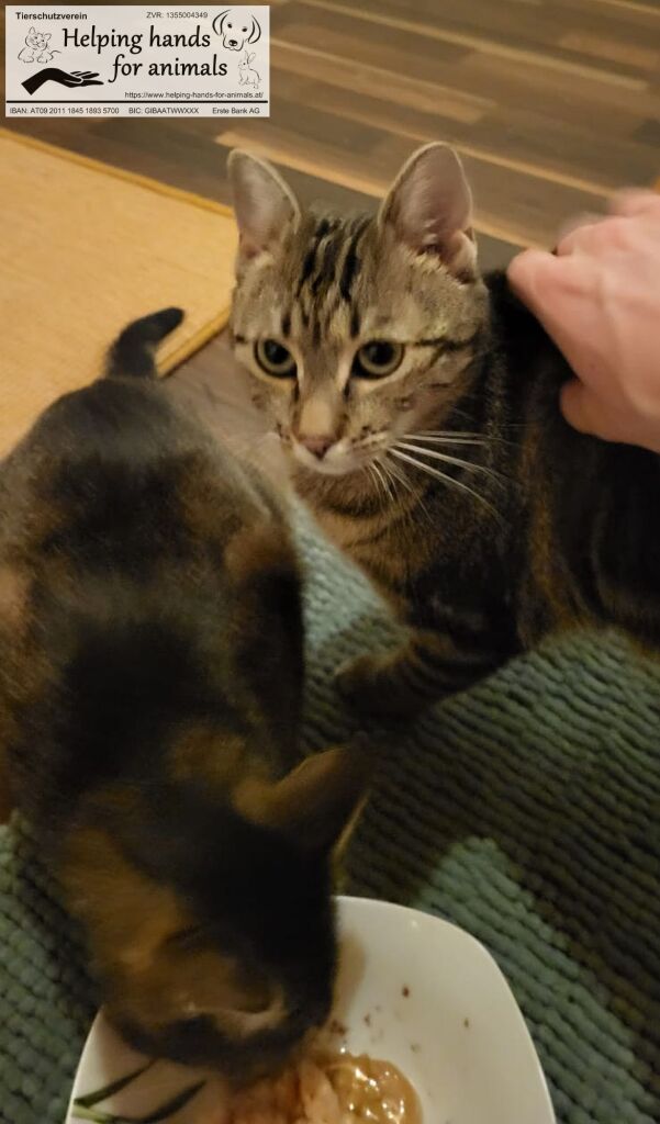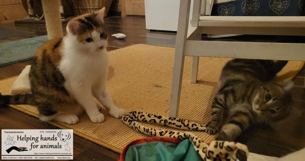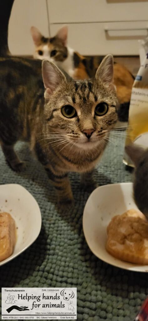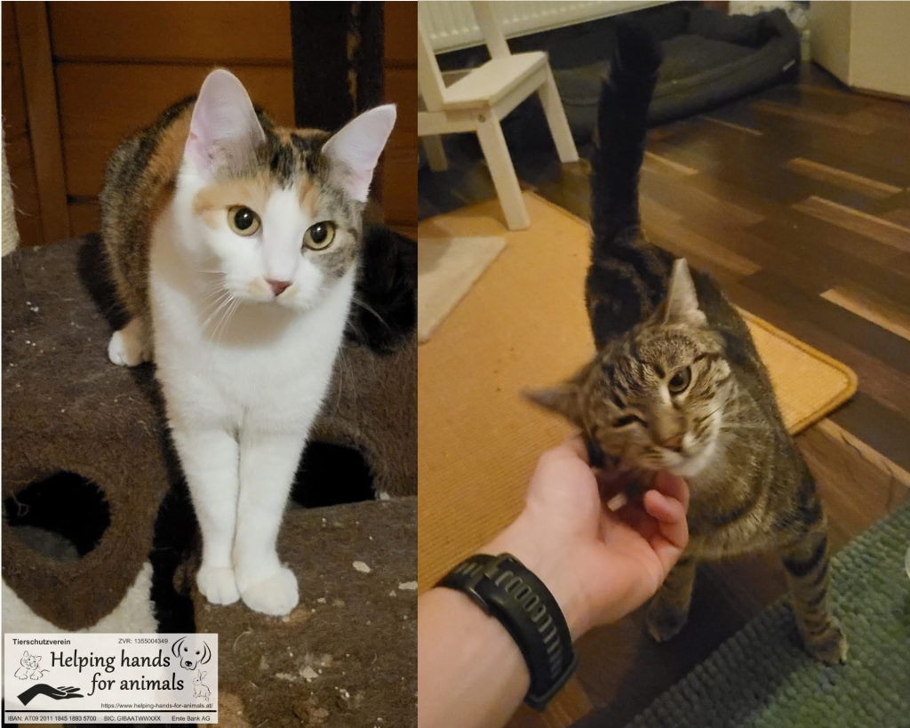 MIA (tricolor) und MARIA (getigert) könnten unterschiedlicher nicht sein. Während MIA immer in einem behüteten Zuhause aufwuchs, musste MARIA ihre 3 Kitten auf der Straße, ohne sicheres zuhause großziehen.
